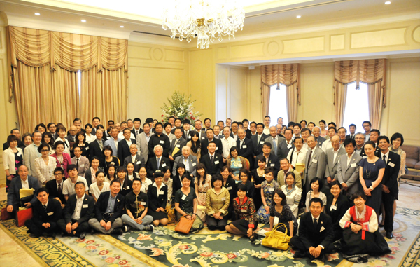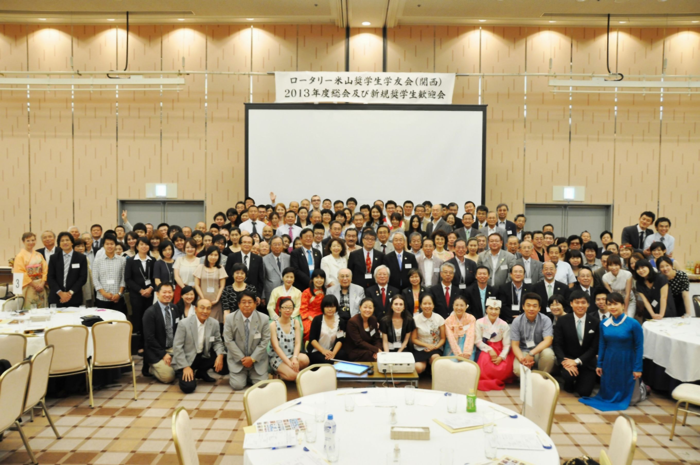 2013年7月7日に行われた2013年度の総会-米山学友大集合の記念写真です。ロータリアン69名、現役奨学生38名、学友59名、事務局員1名、計166名の参加